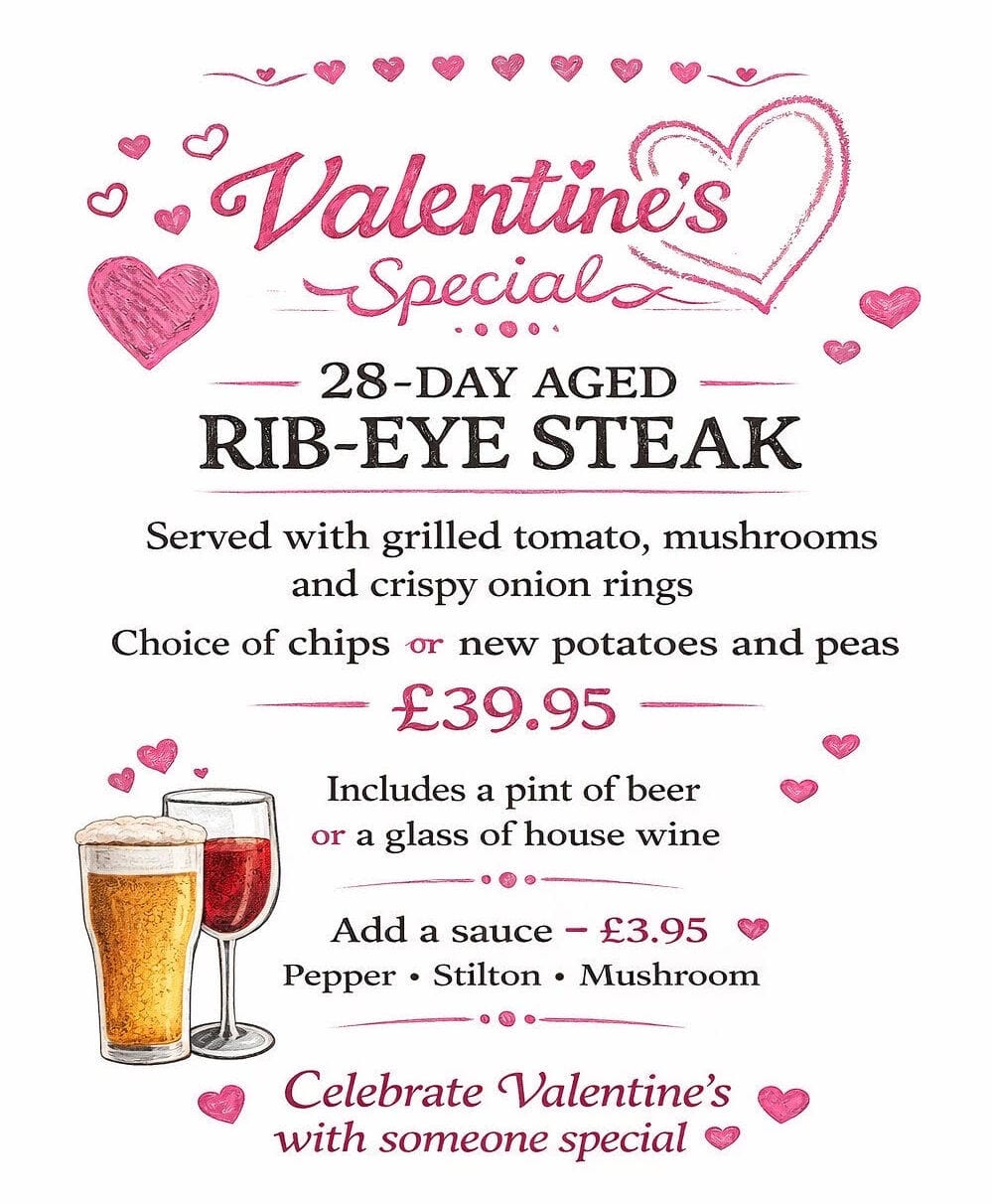 Make this Valentine’s feel like Paris with our Valentine’s Special: two 28‑day aged rib‑eye steaks, flame‑grilled and served with tomato, mushrooms, onion rings, and your choice of crisp chips or buttery new potatoes with peas.